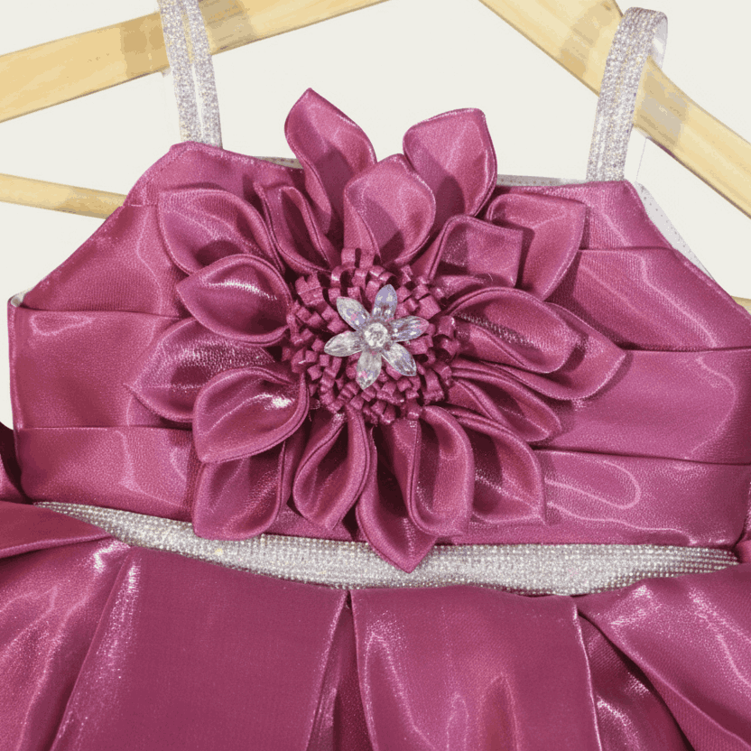 | Material: | Shimmery satin bodice with handcrafted 3D flower; layered satin pleated skirt |