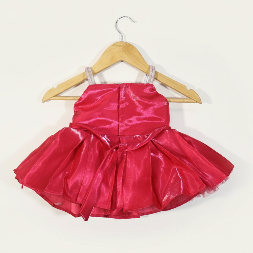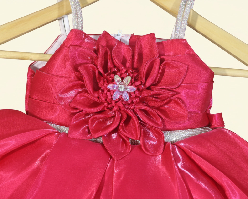Details: Glitter shoulder straps, floral centerpiece, embellished waist belt, structured flare
