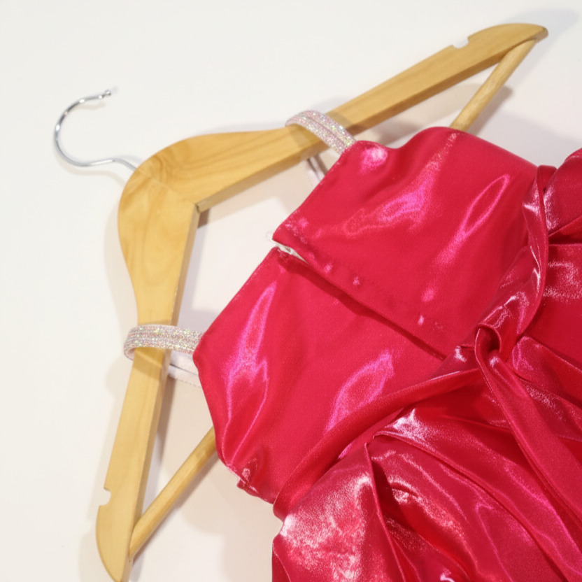 Fabric: Shimmery satin bodice with 3D floral appliqué; layered satin pleated skirt