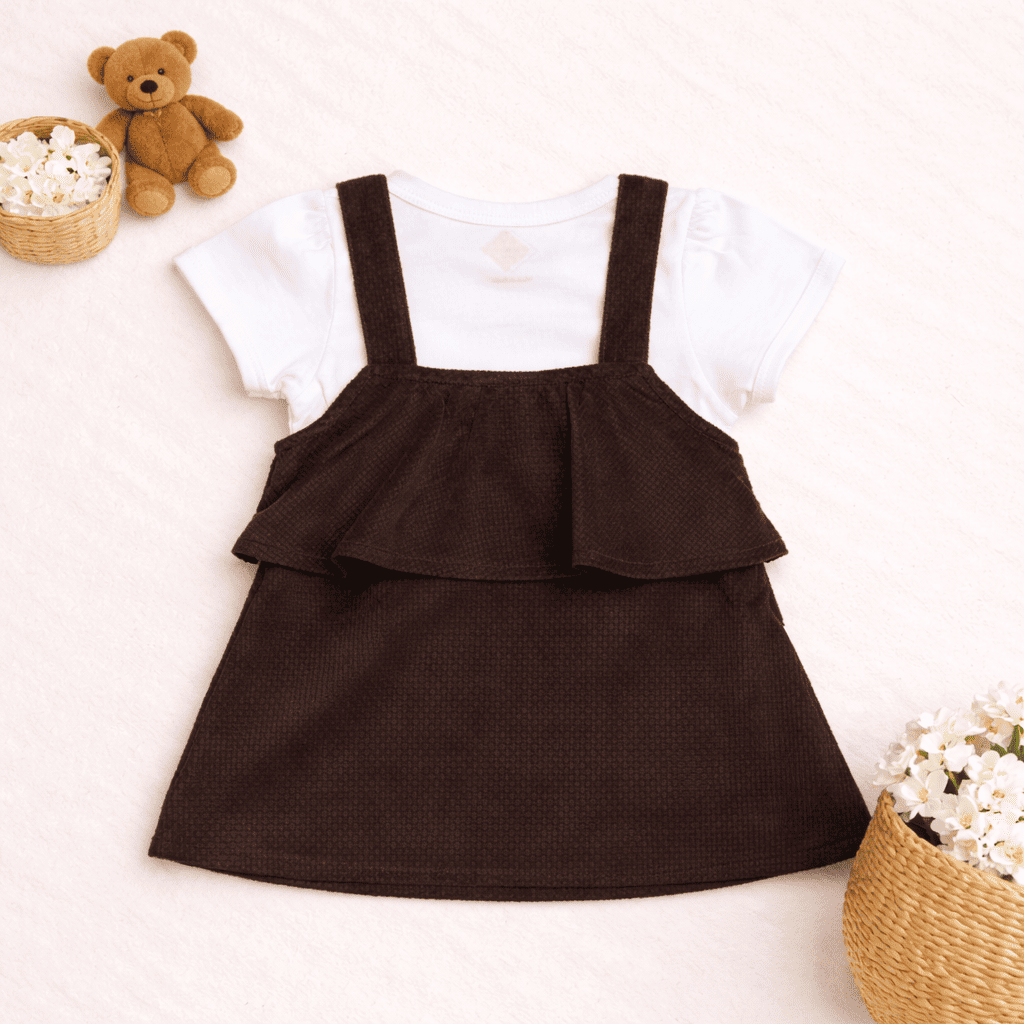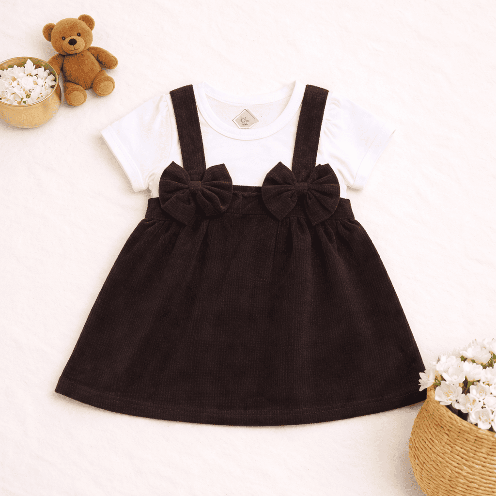 | Design | Two-piece set with brown bow-strap pinafore layered over a white short-sleeve tee |