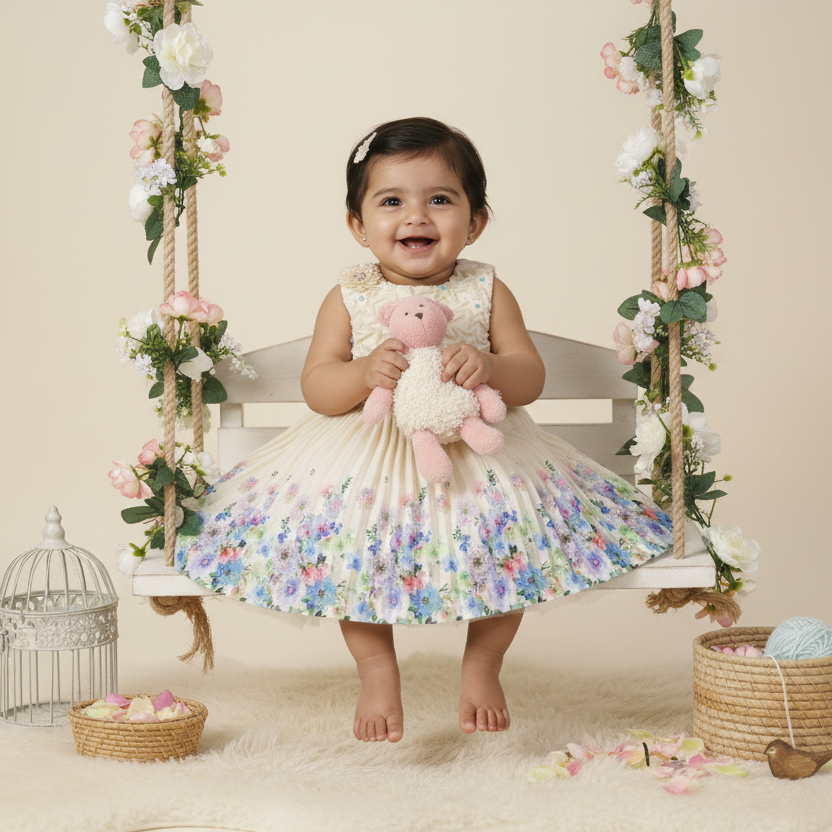 Details: Sparkle embellishments, waist floral cluster, structured flare pleats