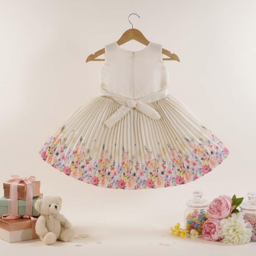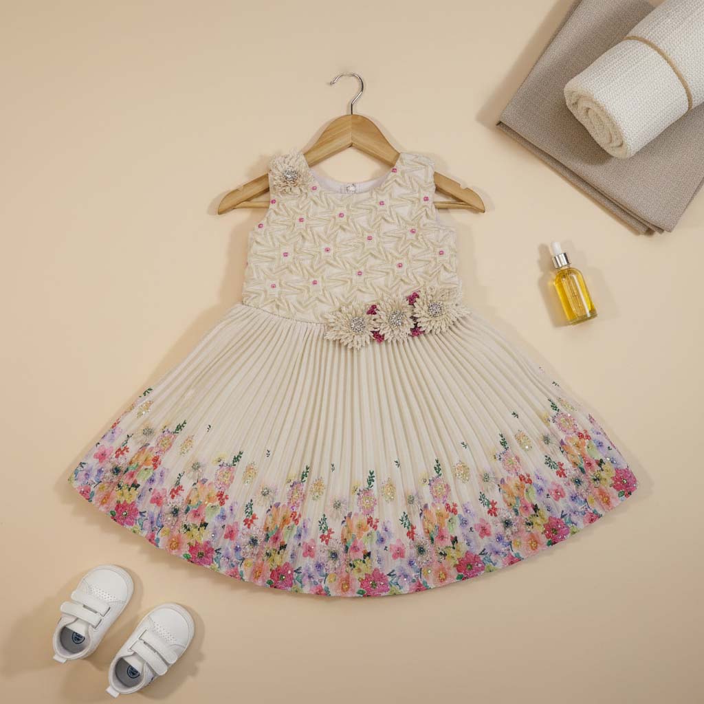 A premium ivory dress with a textured floral bodice and a beautifully pleated skirt featuring a multicolor floral border. Soft lining and elegant detailing make it perfect for birthdays, festive events, and special celebrations. Shop with confidence and convenience, as our online store ensures a seamless shopping experience with secure transactions and prompt delivery to your doorstep.