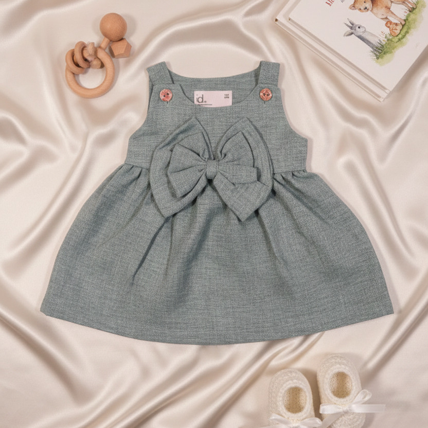 Design: Sleeveless A-line dress with oversized front bow & cute button strap detail