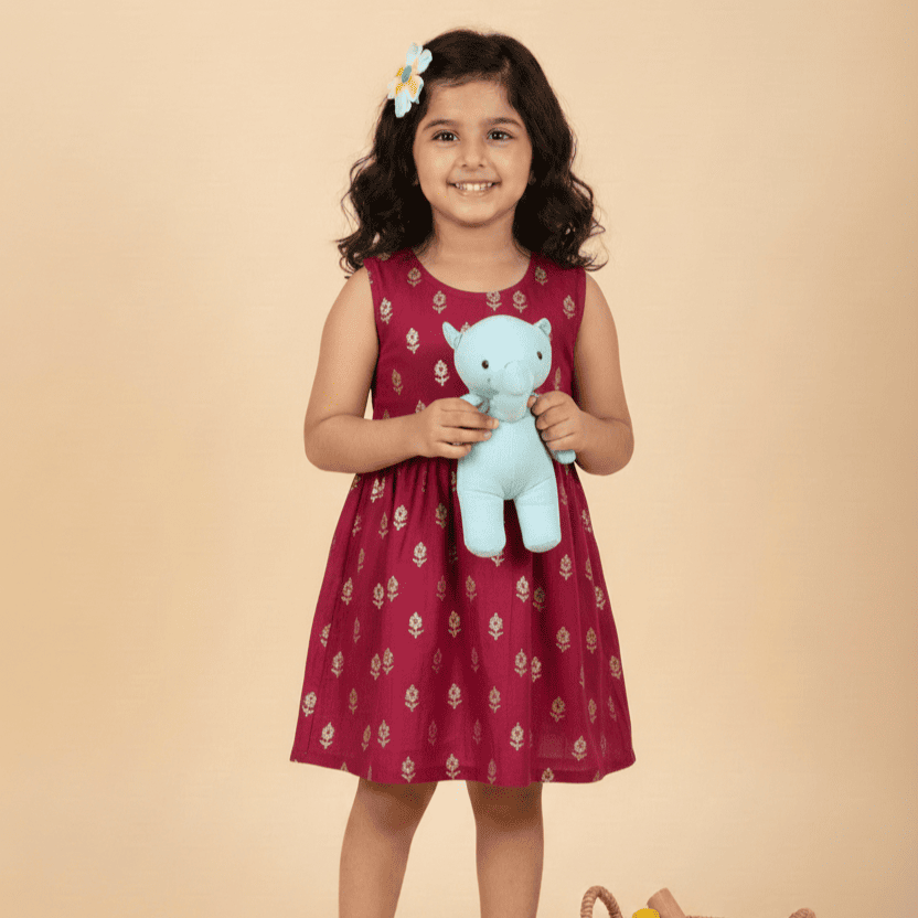 Elegant maroon ethnic dress with delicate gold foil motifs for festive occasions. Lightweight, breathable fabric ensures all-day comfort with a classic traditional look. Shop with confidence and convenience, as our online store ensures a seamless shopping experience with secure transactions and prompt delivery to your doorstep.