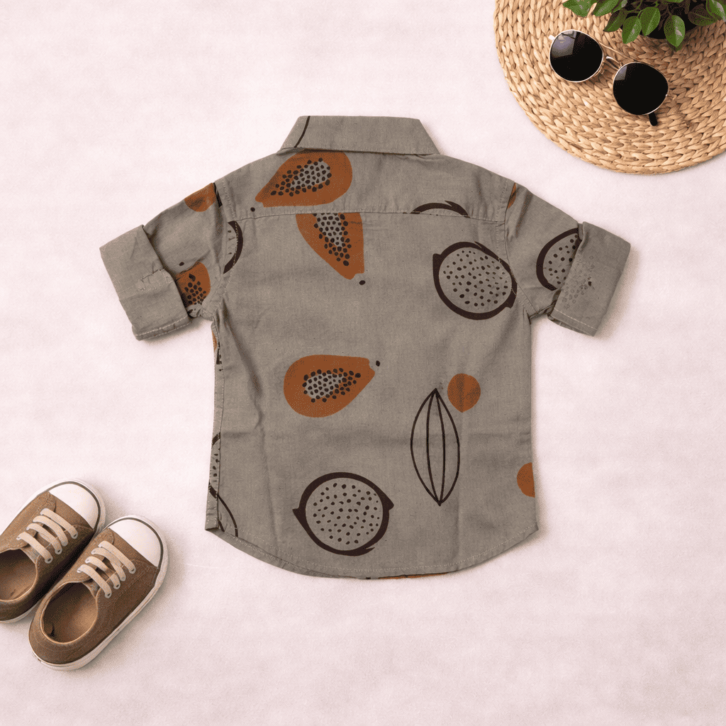Stylish printed shirt featuring earthy abstract motifs, perfect for casual outings and festive wear. Soft breathable cotton keeps kids comfortable while the button-down design adds a sharp, neat look. Shop with confidence and convenience, as our online store ensures a seamless shopping experience with secure transactions and prompt delivery to your doorstep.   Specification : Fabric: Lightweight woven cotton (soft & breathable) Collar: Classic shirt collar Sleeves: Half sleeves with fold-over cuffs Print: All-over abstract leaf & fruit-inspired design Set Includes : 1 Shirt