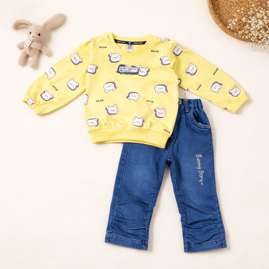 Let her step out in effortless cuteness with this Yellow Bear Print Sweatshirt & Denim Pant Co-Ord Set. Made with soft, breathable fabric to keep her comfy all day and paired with stylish blue jeans featuring cute embroidery. Perfect for outings, casual days, playtime & winter wear!